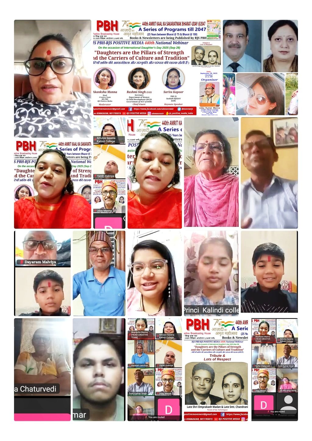नई दिल्ली – अंतरराष्ट्रीय पुत्री दिवस 28 सितंबर 2025 पर आरजेएस पीबीएच -आरजेएस पाॅजिटिव मीडिया द्वारा आयोजित 440 वें राष्ट्रीय वेबिनार में बेटियों को “शक्ति की आधारशिला और संस्कृति-परंपरा की धारक” के रूप में सम्मानित किया गया।वेबिनार की होस्ट, आरजेएस पीबीएच की क्रीएटिव टीम हेड आकांक्षा मन्ना ने “तंग बजट पर घर सम्भालने वाली आम भारतीय महिला” सहित पूर्व प्रधानमंत्री इंदिरा गांधी और कर्नल सोफिया कुरैशी, विंग कमांडर व्योमिका सिंह जैसी भूमिका-मॉडल महिलाओं को नमन किया। “बेटियाँ कल की वास्तुकार हैं,” उन्होंने कहा, और कार्यक्रम को आज़ादी के अमृत काल के दीर्घकालीन नागरिक मिशन से जोड़ा,जो 2047 तक चलेगा।